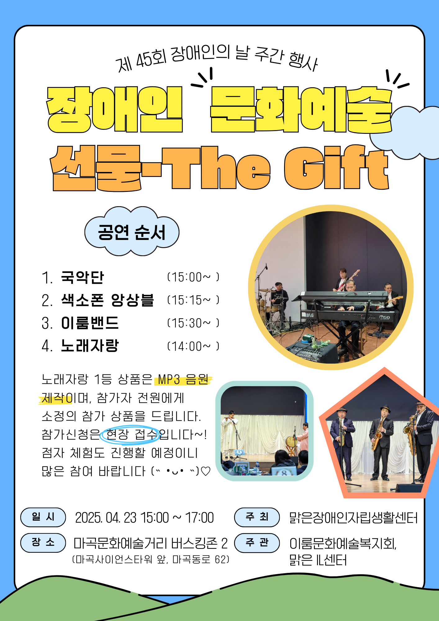 색소폰 앙상블, 국악단, 이룸밴드의 멋진 공연과 함께 현장에서 접수받아 참여할 수 있는 노래자랑, 점자 체험 등 다채로운 프로그램이 마련되어